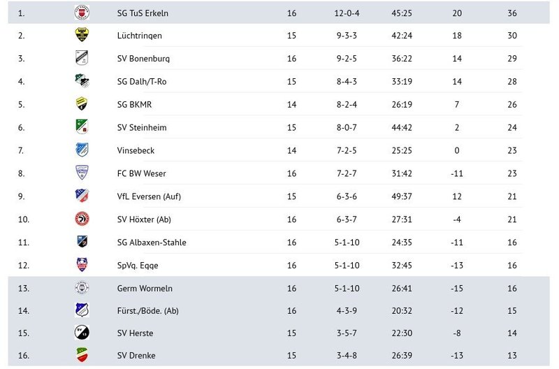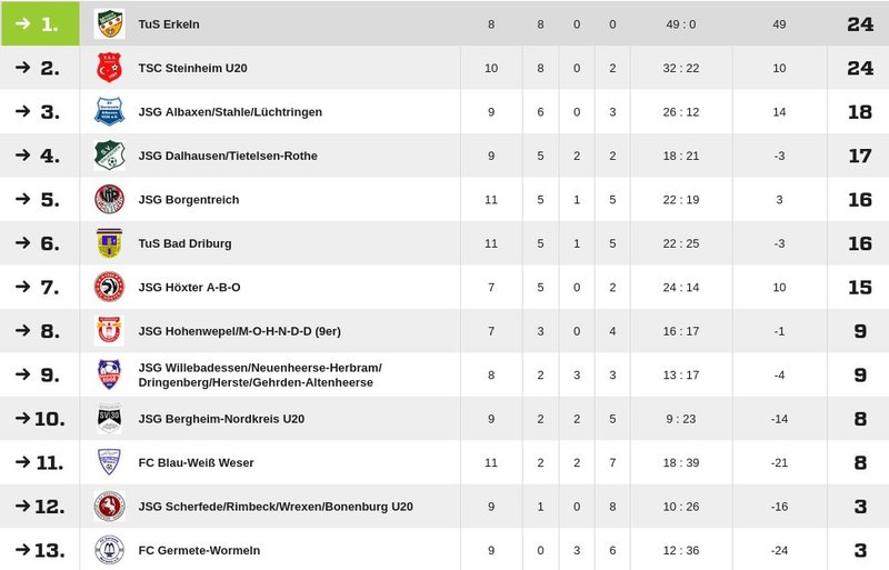 Die SG Erkeln/Hembsen grüßt seit dem 7.Spieltag vom Platz an der Sonne und konnte damit die Herbstmeisterschaft feiern. Herzlichen Glückwunsch! Wenn auch zum Ende nochmal die ein oder andere Partie verloren ging, konnte der 1.Platz gehalten werden.