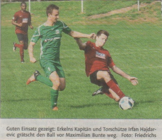 In einer ereignisarmen Partie teilten sich Erkeln und Borchen die Punkte. Erkeln kam gut ins Spiel und übernahm von Beginn an die Kontrolle. Über die Außenbahnen drängten Kevin Köhler und Konstantinos Triantafillidis immer wieder in die Borchener Hälfte. Wirkliche Chancen entstanden dabei aber kaum. Die einzige Möglichkeit hatte Triantafillidis, der jedoch an Borchens Keeper scheiterte (22.). Im zweiten Durchgang änderte sich nicht viel am Spielgeschehen, bis Borchen in Führung ging. Philipp Wegener traf in der 71. Minute. Nur eine Minute später glich Sefa Sener aus. Erkelns Trainer Erdogan Acar war mit dem Remis bedingt zufrieden. »Wir waren über weite Strecken die bessere Mannschaft, hatten aber nicht genug Chancen. Dennoch geht der Punkt in Ordnung«, lautete sein Fazit.
