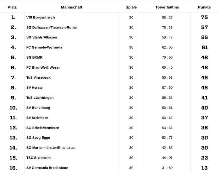Abschlusstabelle Fußball Kreisliga-A Höxter 2024/25