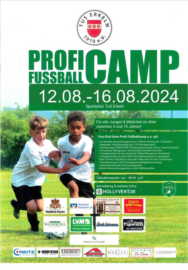 In der letzten Sommerferienwoche veranstaltete der TuS Erkeln 1910 e.V. mit der Fussballschule HOLLYVENT aus Boffzen zum zweiten Mal ein Profi-Kinderfussball-Camp am Erkelner Sportplatz.